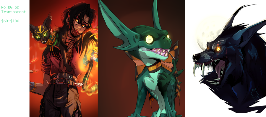 I have various types of digital art commissions ranging from character busts, single character pin-ups and images featuring characters with transparent or from simple to detailed backgrounds.