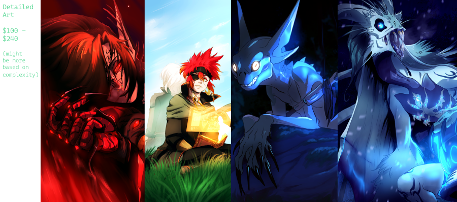 Extra charges range anywhere between 25 - 50% depending on the complexity of what's asked to be drawn.*Examples: Detailed dragons, weapons, armor, complex character designs (Like bahamut from Final Fantasy 10 or omnimon from Digimon), Difficult backgrounds and perspectives, to name a few.*However, they may also be applied characters that exceed the limit of 2 characters per image.